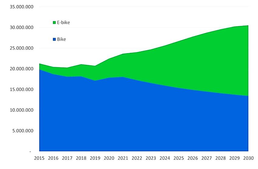 Figura. 1 Vendita previste delle biciclette e-bike (bici con pedalata assistita) fino al 2030[3]