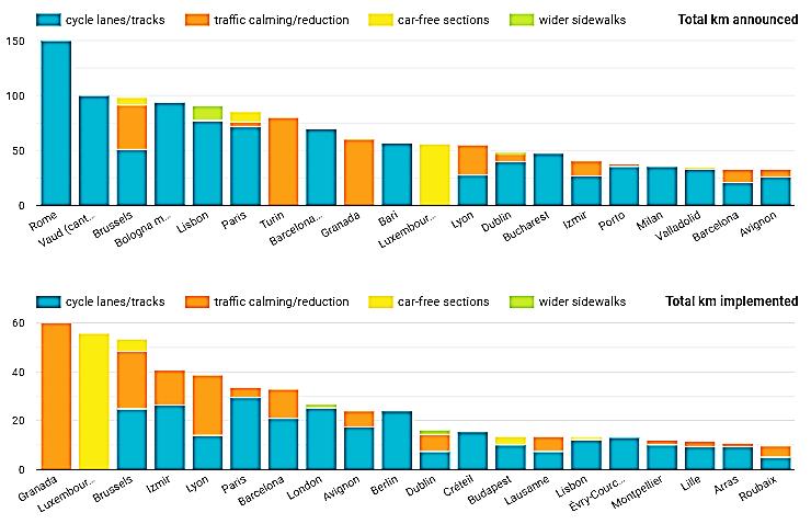 In Italia sono da segnalare le politiche di implementazione delle piste ciclabili attuate da Roma e Bologna mentre Torino emerge nella progettazione di strade urbane a velocità ridotta (fig.2).