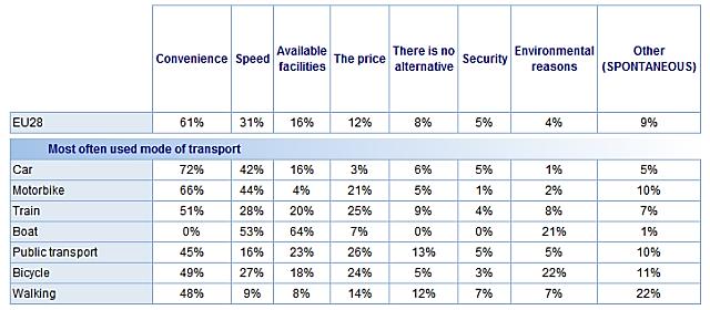 Alla domanda “Per quale ragione usi questa modalità di trasporto” fatta a un campione europeo di 27.678 viaggiatori, il 49% dei ciclisti ha risposto perché è conveniente, il 27% perché è la modalità di spostamento più veloce, il 24 % perché costa poco; solo al quarto posto emergono fattori comportamentali dettati dalla sensibilità ai temi ambientali (il 22%).